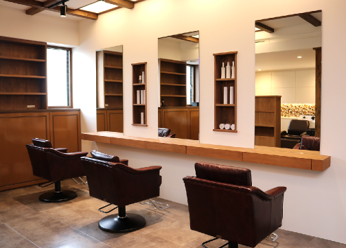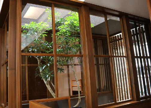 サロンには中庭や随所に木を使った優しく重厚感がある空間が広がっています。